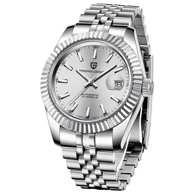 O Pagani Design NH35 apresenta uma caixa em aço inoxidável com 42mm de diâmetro e 12mm de espessura, garantindo resistência e elegância. O cristal de safira protege o mostrador, oferecendo excelente resistência a riscos e clareza visual. A pulseira em aço inoxidável (22cm de comprimento) possui um fecho dobrável com segurança, proporcionando ajuste firme e confortável no pulso.
