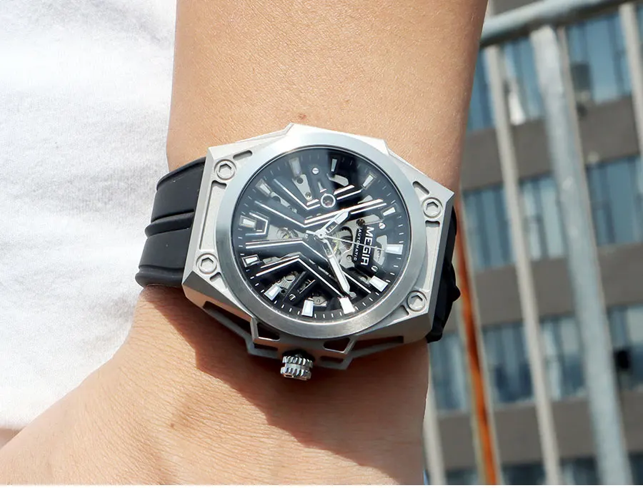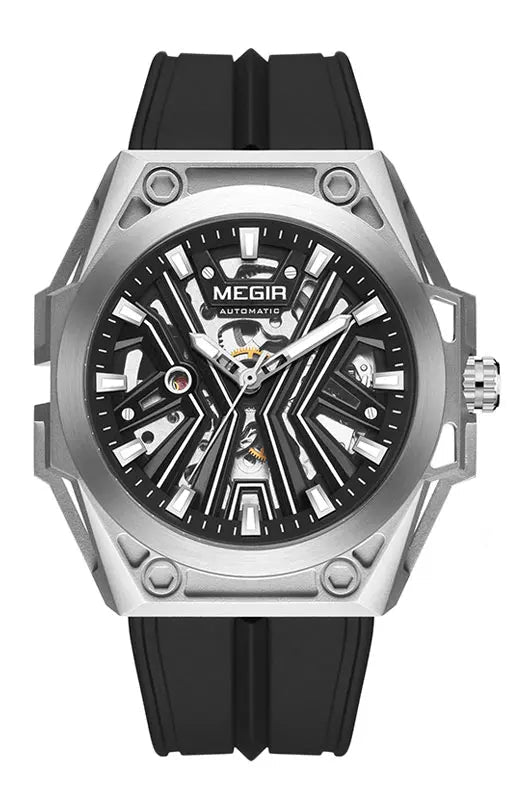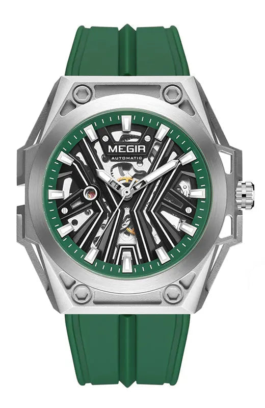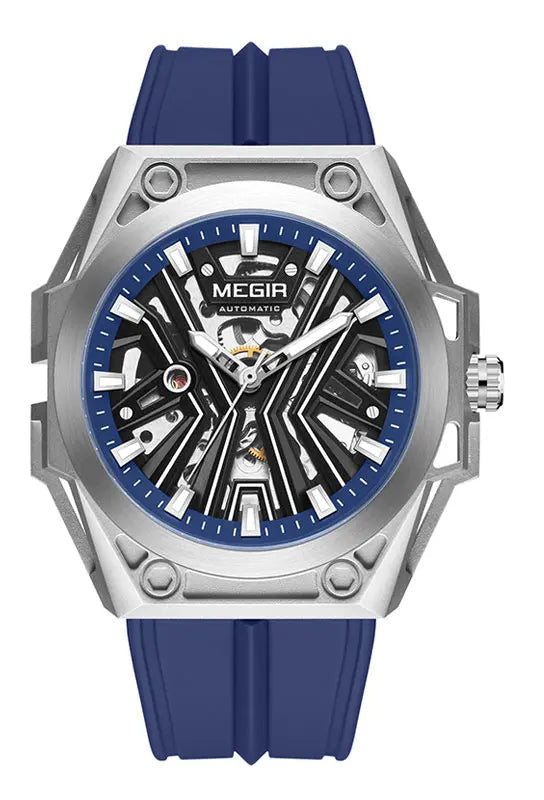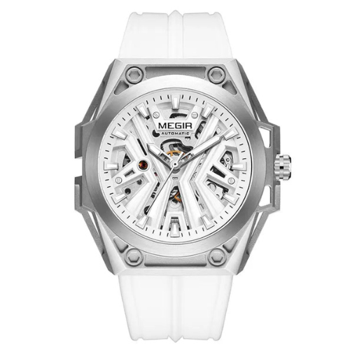 O MEGIR MN8603GWE-7 apresenta um fascinante mostrador esqueleto que revela a complexidade do movimento mecânico, perfeito para entusiastas de relojoaria. Com caixa em aço inoxidável (45-49mm) e 15mm de espessura, este modelo une presença marcante e durabilidade. O cristal Hardlex oferece proteção superior, enquanto a pulseira em silicone (20cm) garante conforto em qualquer atividade.
