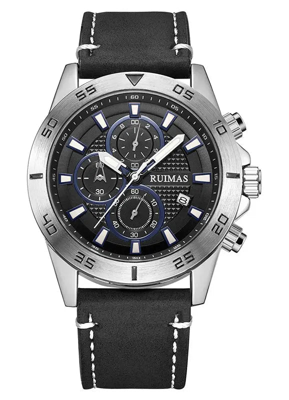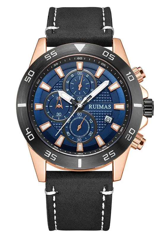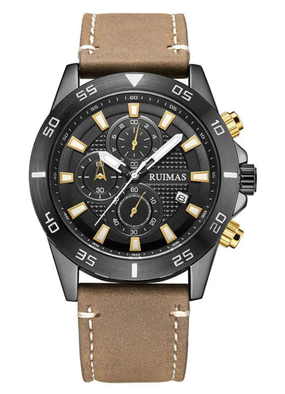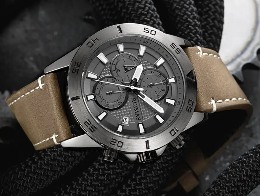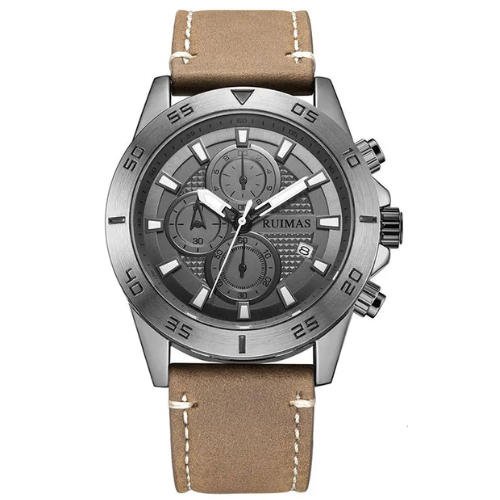 O MEGIR & RUIMAS RL572G apresenta um design equilibrado entre esporte e elegância, com caixa em liga metálica (46mm de diâmetro e 13mm de espessura) que oferece leveza sem sacrificar a resistência. O cristal Hardlex protege o mostrador cronógrafo, enquanto a pulseira em couro genuíno (24cm de comprimento) garante conforto e sofisticação, complementada por um fecho em fivela.