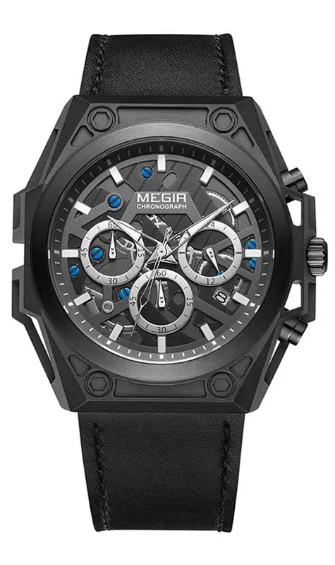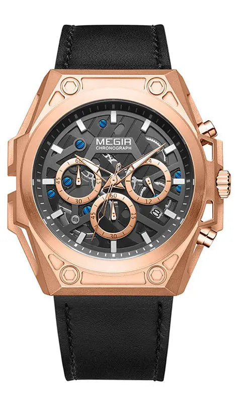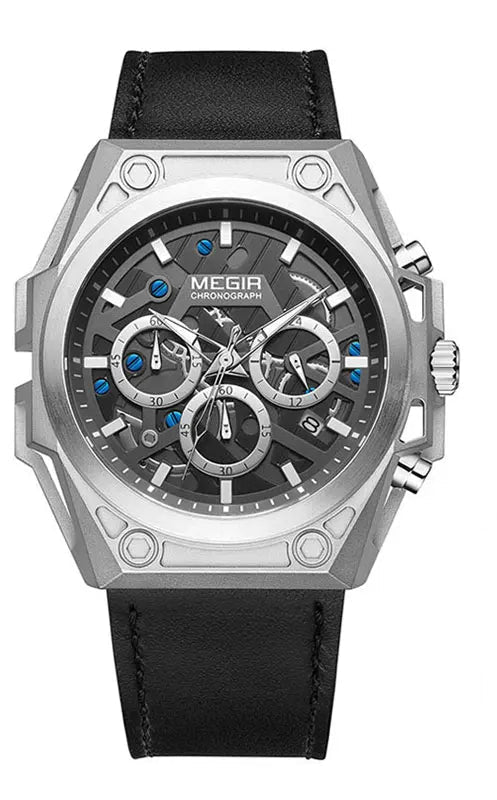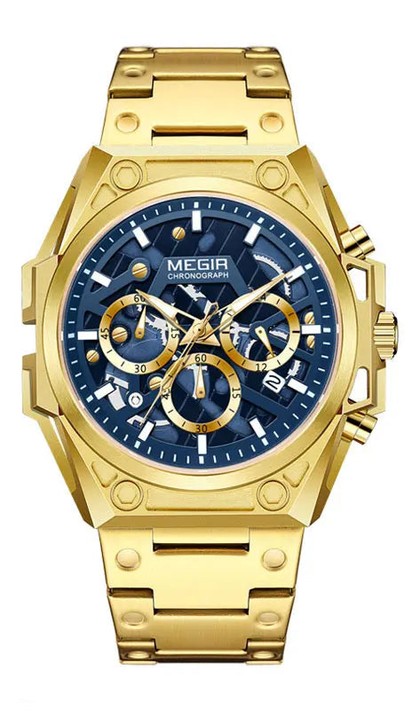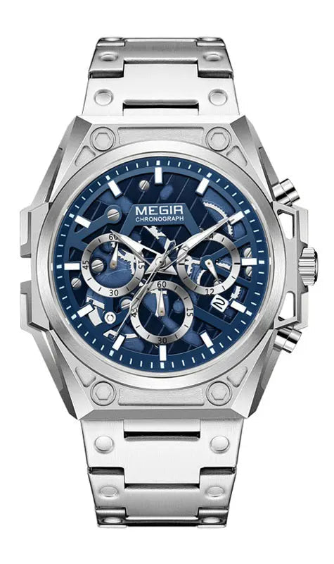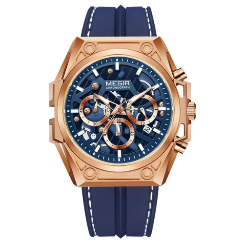 O MEGIR MN4220GRE impressiona com seu design tonneau moderno em aço inoxidável (47mm), perfeito para quem deseja um visual esportivo com toque de sofisticação. Com 15mm de espessura, este relógio oferece presença marcante no pulso sem comprometer o conforto. O cristal Hardlex protege o mostrador contra impactos, enquanto a pulseira em silicone azul (22cm) garante flexibilidade durante atividades intensas.