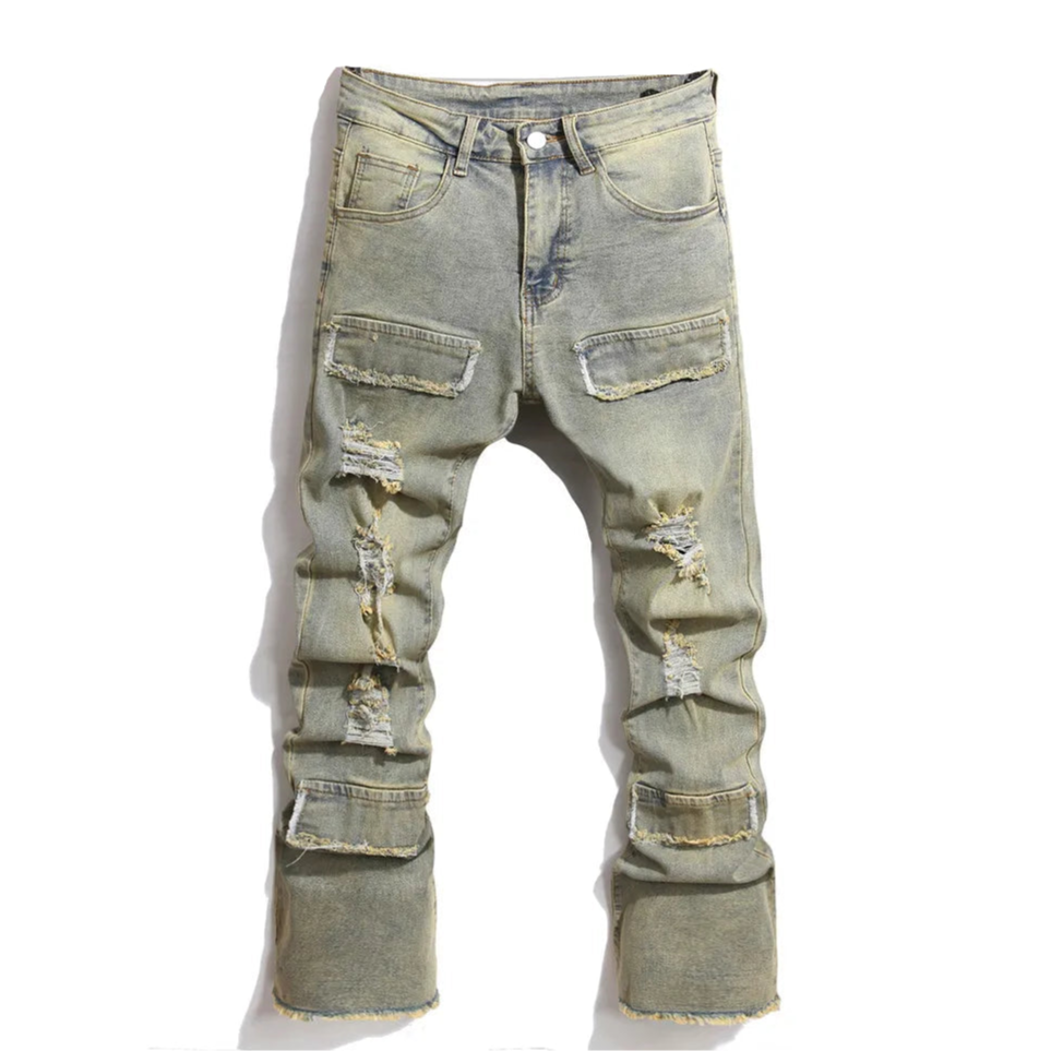Com visual ousado e autêntico, este jeans slim combina rasgos e recortes inspirados no estilo retrô e hip hop. Ideal para quem busca um visual urbano, moderno e cheio de atitude.